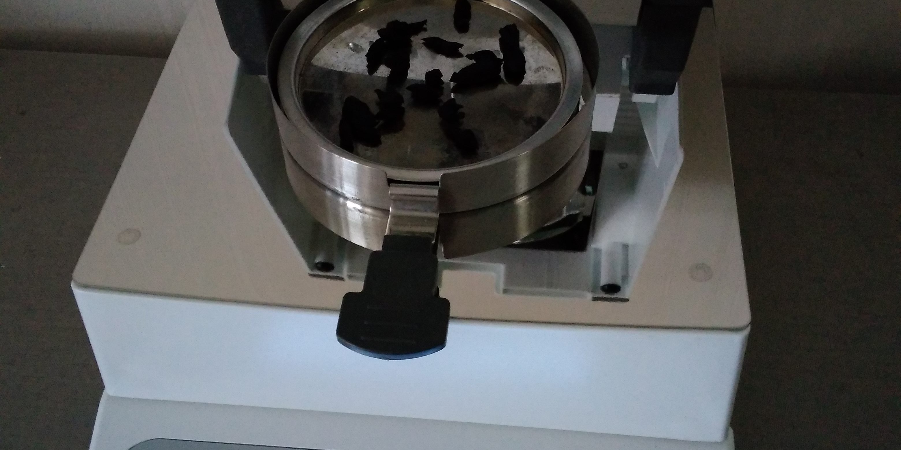 測(cè)試話梅干碎:為了使測(cè)試過(guò)程中話梅干水分儀將話梅干烘干烘透,我們將話梅干用剪刀剪成碎片,攤成分散狀,以便溫度能滲透進(jìn)去。取3克左右話梅干碎均勻鋪撒在不銹鋼托盤(pán)中,用鑷子將話梅干碎平鋪均勻,為使話梅干水分完全烘干并且不變焦,我們將溫度設(shè)置在160℃,按“START”鍵開(kāi)始測(cè)試,25分04秒后檢測(cè)結(jié)束,檢測(cè)數(shù)據(jù)顯示58.44%;