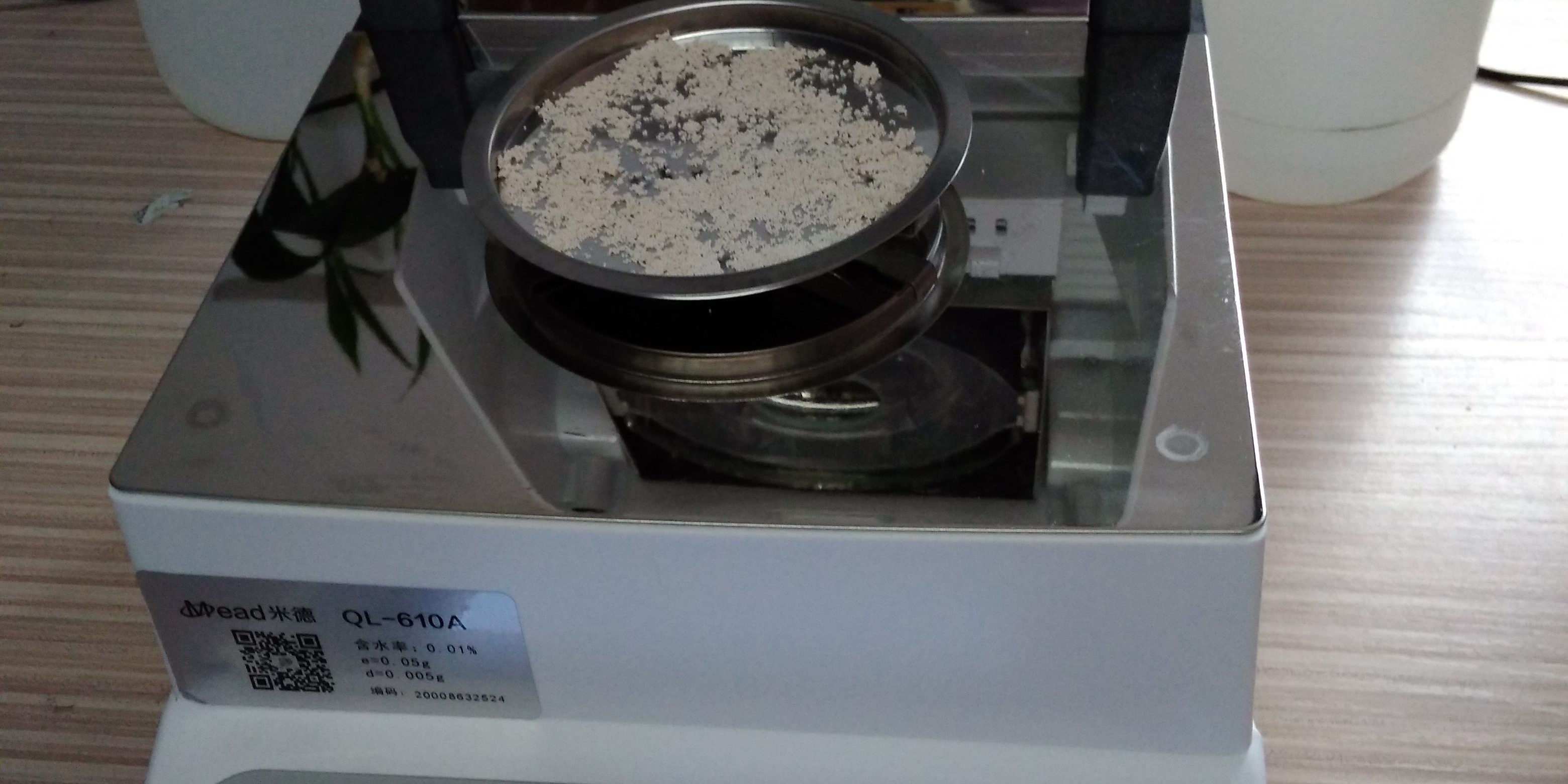 - 測(cè)試樹(shù)脂顆粒:倒出4克左右樹(shù)脂料顆粒倒在不銹鋼托盤中,為了使測(cè)試過(guò)程中樹(shù)脂水分儀將樹(shù)脂料烘干烘透,我們將樹(shù)脂顆粒攤成分散狀,以便溫度能滲透進(jìn)樹(shù)脂內(nèi)部。用鑷子將樹(shù)脂顆粒平鋪均勻,為避免樹(shù)脂顆粒烘烤后變焦變黑,我們將溫度設(shè)置在105℃,按“START”鍵開(kāi)始測(cè)試,15分07秒后檢測(cè)結(jié)束,檢測(cè)數(shù)據(jù)顯示56.57%;
