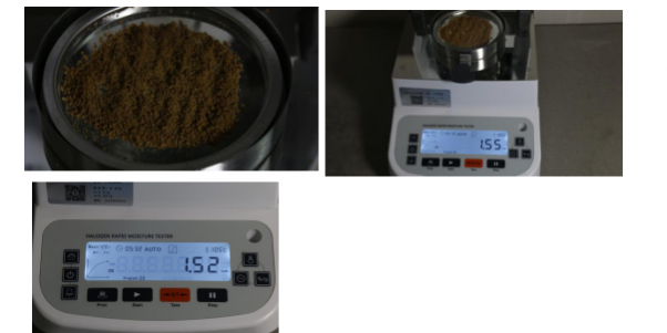 測試樣品1:用實驗勺提取4克藥品,置于不銹鋼托盤中,用實驗勺將藥品平鋪平均,溫度設置 105℃用儀器進行加熱,約5分鐘后檢測結束,檢測數據顯示1.52%;