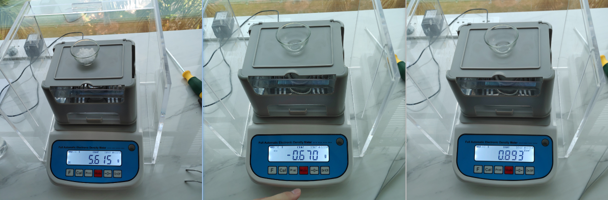 - 將塑料顆粒(樣品1)放在架子上面顯示空氣中的重量615g,然后按mode鍵記錄下重量,再將塑料顆粒放入水中顯示水中重量0.670g,按下mode鍵記錄下重量。顯示密度值0.893g/cm3。
