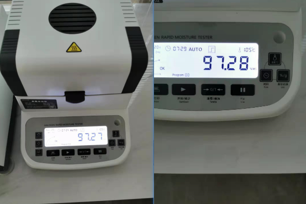 第一步、給測(cè)試儀接上電源,調(diào)整水平后. 在稱量盤上墊層玻璃纖維紙,按清零鍵.搖動(dòng)乳液以后 取3克左右鋪勻在盤中,按開始測(cè)試,儀器根據(jù)失重率自動(dòng)停機(jī),此時(shí)屏幕上顯示的是水分值97.27%,再按單位鍵,可切換顯示為固含量值2.73%